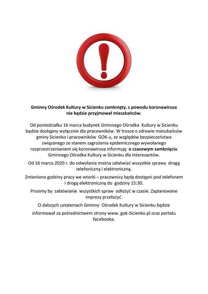 Prosimy by załatwianie wszystkich spraw odłożyć w czasie. Zaplanowane imprezy przełożyć. O dalszych ustaleniach Gminny Ośrodek Kultury w Sicienku będzie informował za pośrednictwem strony gok-sicienko.pl oraz portalu facebook.